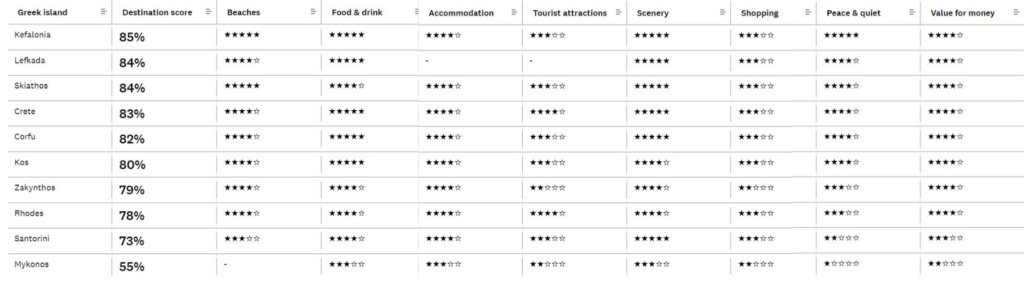 Οι συνδρομητές του Which? λοιπόν αξιολόγησαν τα 10 Ελληνικά νησιά και οι αξιολογήσεις τους φαίνονται στην εικόνα. Κάποια βασικά συμπεράσματα που μπορούμε να βγάλουμε από την έρευνα αυτή είναι: